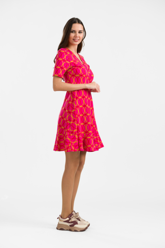Leuke wikkeljurk in knalroze met lome groene en roestrode cirkels. onderaan zit een vrolijke roezel