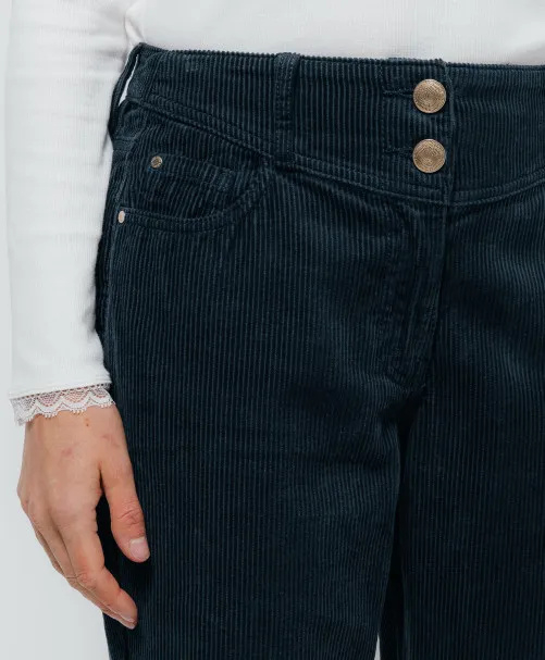 Leuke donkerblauwe katoenen ribbroek met aan de onderkant omgeslagen pijpen. Die kunnen ook naar beneden, maar geven nu een leuk effect. Net als de 2 knopen in de band, die heeft ook lusjes dus een riem kan makkelijk. Het model Eddy loopt smal toe en heeft ook 2 zakken op de achterkant.