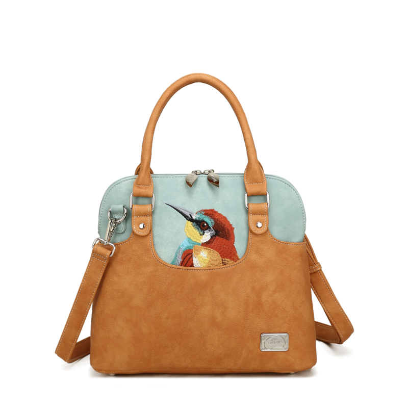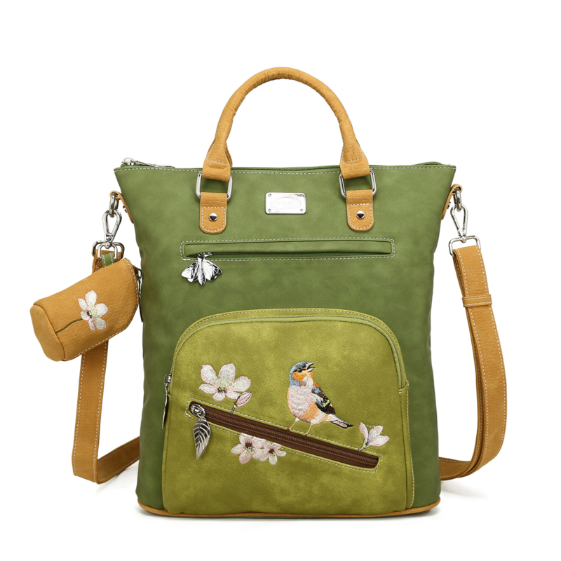 Hi-di-Hi tas Lucky bird GreenDe Lucky Bird, vernoemd naar het goudvinkje dat op de voorkant is geborduurd, wandelt over een heuvellandschap van patchwork en verandert je tas in een klein landschapje op zich.