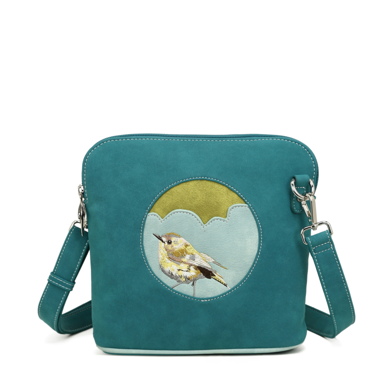 Hi-di-Hi tas Lucky bird PetrolDe Lucky Bird, vernoemd naar het goudvinkje dat op de voorkant is geborduurd, wandelt over een heuvellandschap van patchwork en verandert je tas in een klein landschapje op zich.