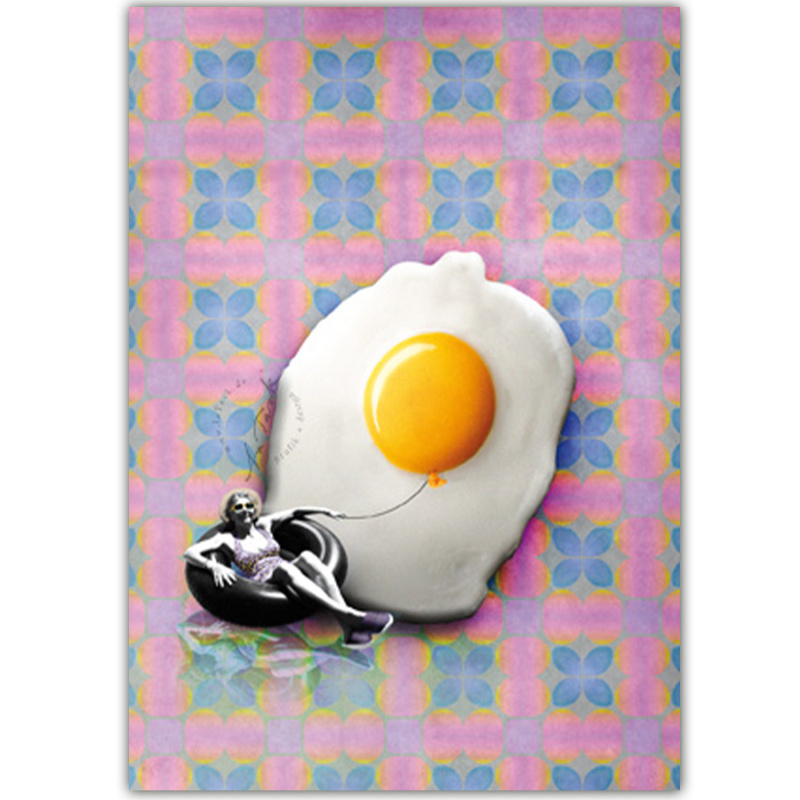 Gefeliciteerd ei-ballon kaartMixed media, mat glans, getekend en gefotografeerd, en vooral met humor