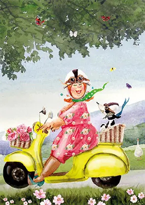 Blij op de scooter kaartPostkaart van Ingrid Berendsen.