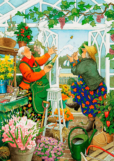 Champagne in de kas kaartDeze illustraties van Inge Löök zijn vooral inspiraties uit haar eigen omgeving of leven. Zeer herkenbaar en vrolijk