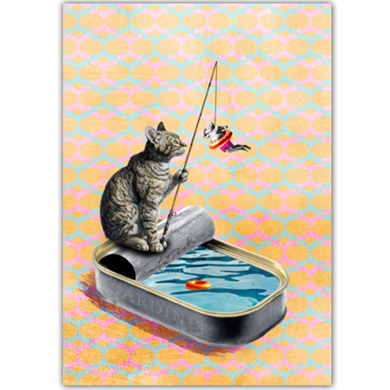 Sardientjes vangen kaartMixed media, mat glans, getekend en gefotografeerd, en vooral met humor
