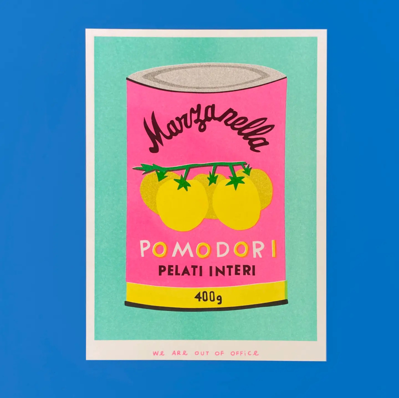 Resin print - Blik pomodoriRisograph-afdruk van een knalroze blik tomaten. Elke afdruk is enigszins verschillend door deze techniek, wat elke print uniek maakt. Mooi in een lijstje...