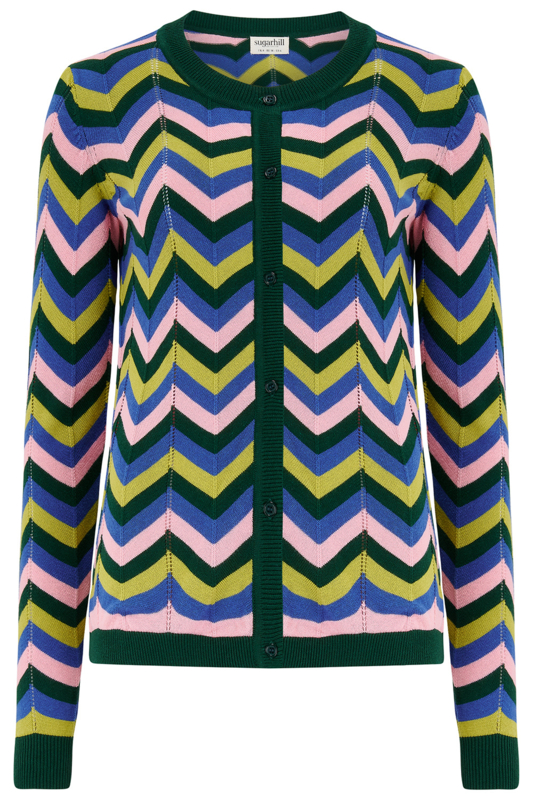 Sugerhill - Cardigan Rochelle Chevron multi oceanEen leuk vestje die je outfit net even dat extra kan geven. Ajour gebreid in blije zigzag in roze, grasgroen en flessengroen en een korenbloemblauw.