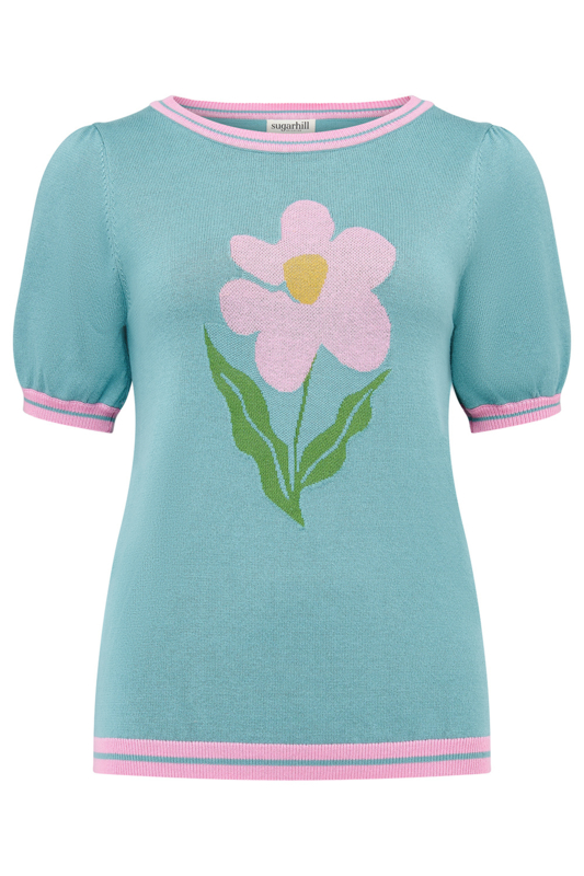 Sugarhill - Dominique top FlowerVrolijk katoenen truitje met roze boorden en naturlijk een toffe bloem!